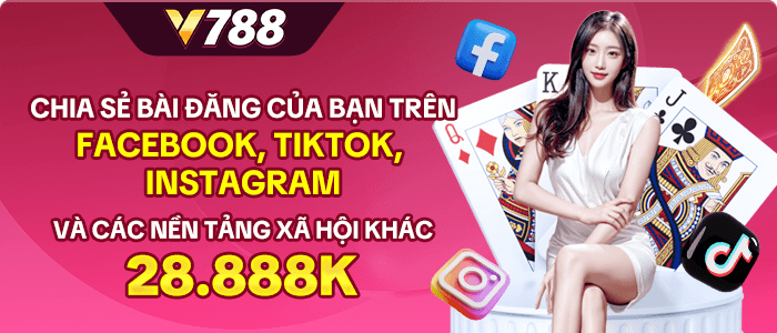 Chỉ vài thao tác đơn giản ai cũng có thể nhận được số tiền 28,888K tại v788z Com khi chỉ cần chia sẻ trang chủ nhà cái trên các nền tảng mạng xã hội như Tik Tok, Facebook, Telegram,…người chơi sẽ nhận được số tiền lớn trải nghiệm.